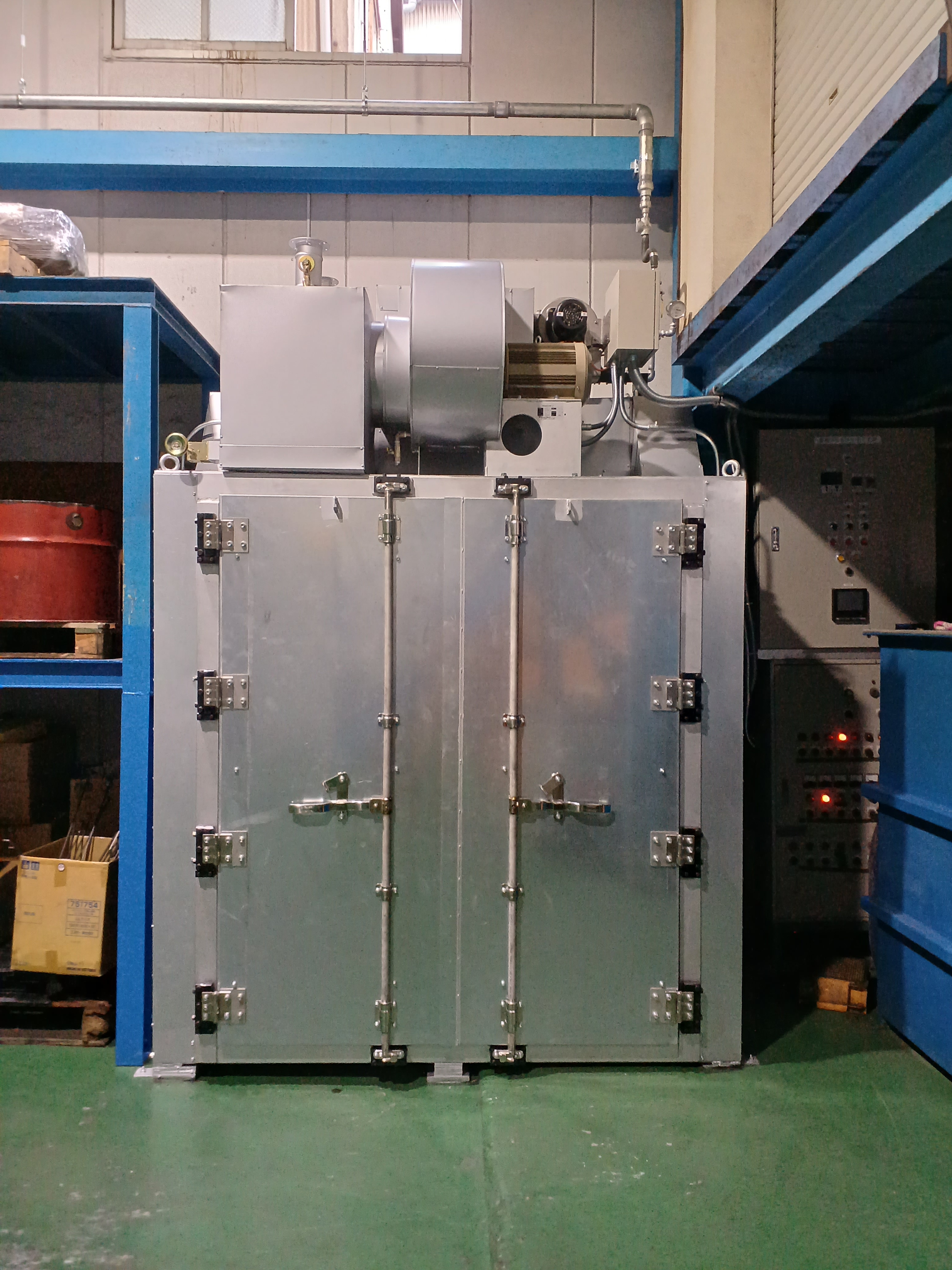 ガス式乾燥炉は、主に炉本体(チャンバー)、熱源となるガスバーナー、炉内の空気を循環させるための循環ファン、そして燃焼ガスを排出する排気ダクトといった要素から成り立っています。