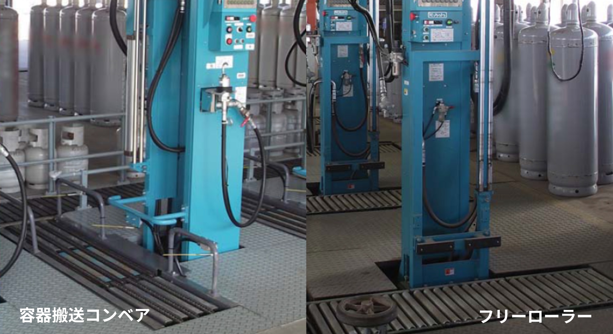 50kg~5kg(サイフォン含む)容器を半自動で充填することができます。5kg未満の容器は手動ノズルで充填が可能です。