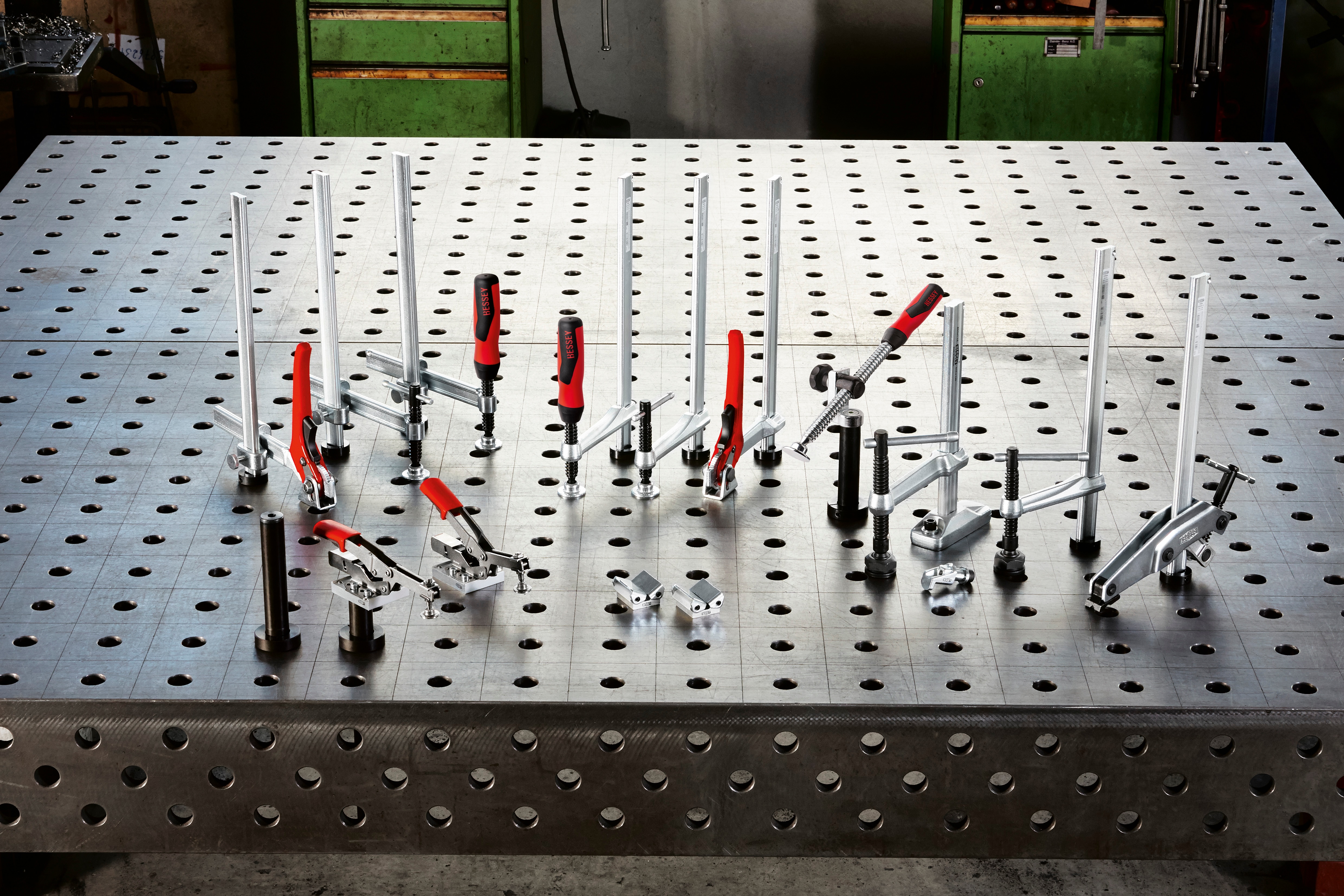 専用のクランピングエレメントを組み合わせて固定することにより、精度の高い溶接と溶接時の歪みを抑えることができる新時代の溶接専用定盤です。